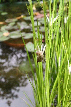 睡蓮と一緒に栽培しているシラサギカヤツリにヤゴの殻が付いていました。