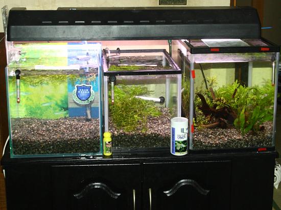 さて今はこのキューブ水槽を含めて3本の水槽を自慢の木製水槽台に並べて置いています。