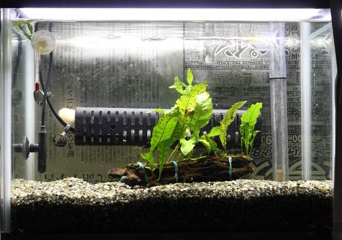 36cm水槽に大磯砂を使った底面濾過で、水草は流木に活着させているミクロソリウムを一つ入れてあります。
