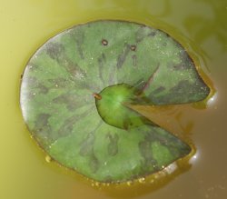 右の写真を見て頂くとわかるのですが(小さい葉っぱではあるのですが)全ての浮葉にこのような斑が入っていました。