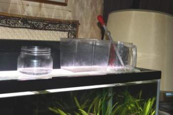 私は右の写真のように水槽の上に置いて湧かしています(ブラインを沸かしているのは左と真ん中の容器です)。